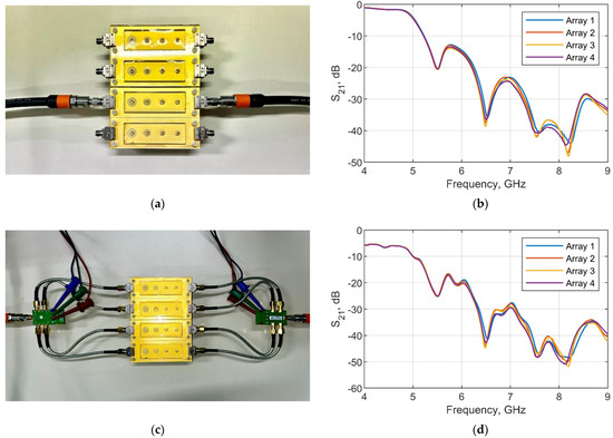 (a) Sensor arrays 1 to 4 having empty PDMS microplate wells; (b) the transmission frequency response of structures having empty PDMS microplate wells; (c) interconnected sensor arrays 1 to 4 having PDMS microplate wells with microwave switches and coaxial cables; (d) the transmission frequency response of sensor arrays with PDMS and switches.