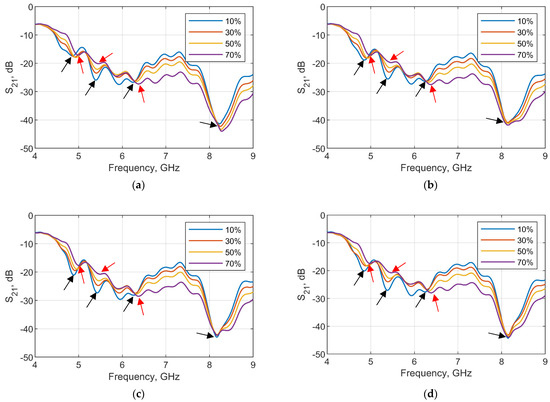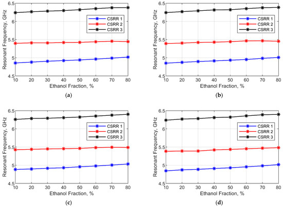 The comparison of data in Figure 5a,b shows that there is a good match between designed and manufactured CSRRs with respect to the resonant frequency, which confirms the design approach and methodology. The transmission coefficient levels are lower when four CSRRs are connected in a cascade due to a change in the characteristic impedance of the transmission line on frequencies higher than CSRRs resonant frequency generating additional reflections and losses. Furthermore, the data comparison in Figure 6b,d shows the additional losses brought by switches in the measurement path. Nevertheless, those additional losses are taken into account by sensor calibration.