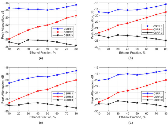 According to Equation (3), by knowing the transmission frequency response of the sensor, it is possible to determine the complex permittivity of a MUT. To verify the mathematical model, the set of samples with an ethanol concentration of 20%, 40%, 60%, and 80% was used. The resonant frequency observed while measuring each sample was linearly increasing with ethanol percentage shown in Figure 8. On the other hand, the change in peak attenuation was not linear, shown in Figure 9. Finally, the calculated relative complex permittivity of the samples using CSRR1, 2, and 3 in array 1, compared with the one obtained using a dielectric probe, is shown in Figure 10.