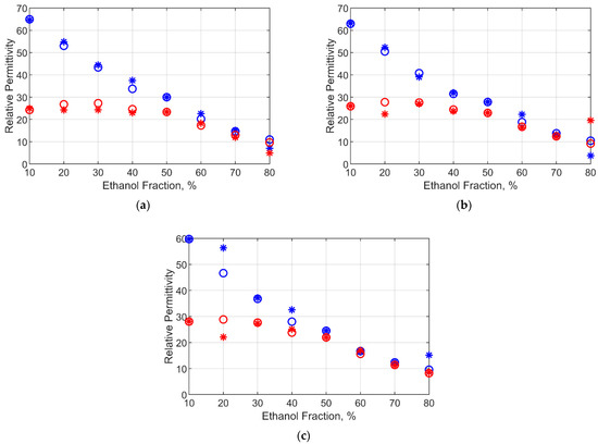 Relative permittivity of the samples obtained using sensors in array 1 (a) CSRR1, (b) CSRR2, (c) CSRR3 as stars, and values obtained using dielectric probe as circles, with blue indicating real part and red indicating imaginary part.