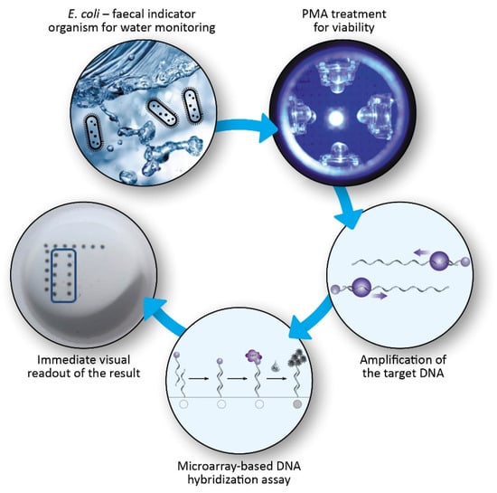 Thus, suitable detection methods for specific identification and sensitive quantification of these indicator organisms are mandatory, with the additional challenge of precisely detecting viable cells. Common techniques for routine diagnosis of E. coli in drinking water rely upon culture-based approaches. According to the drinking water ordinance, three different detection procedures are approved and ISO (International Organization for Standardization) certified [DIN EN ISO 9308-1, DIN EN ISO 9308-2, DIN EN ISO 9308-3]. Primarily, traditional cultivation for quantifying bacteria in drinking water is applied (membrane filtration combined with subculture on different media). Nevertheless, this method has several disadvantages. First and foremost, it takes 18–24 h for the sample-to-answer process [3]. Furthermore, nutrient-rich traditional media support the growth of non-targets that can mimic or suppress target organisms, yielding false negative results. Second, water quality is evaluated by the “most probable number” method which is based on the growth of target organisms in a liquid medium and the subsequent calculation of the “most probable number” (MPN) of organisms with reference to MPN tables. This approach for quantifying is used in the Bluewater Biosciences ColiPlate™ kit [6]. In addition, the US Environmental Protection Agency (EPA)-approved Colilert Quanti-Tray is used to monitor the presence or absence of coliforms and E. coli, as well as to quantify their levels within 18 to 21 h [http://www.idexx.de/water/water-testing-solutions.html] (accessed on 25 October 2021) [6].