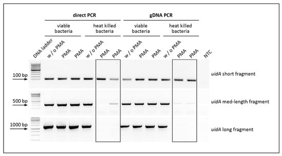 Impact of different fragment lengths on signal reduction of heat killed cells, displayed on an analytical agarose gel. Viable and heat killed E. coli cells were treated with or without (w/o) PMA. Direct PCR or classical PCR was performed using isolated gDNA as a template with three different primer pairs for three different target regions of the uidA gene (long 1370 bp, medium 556 bp, short 96 bp). Two independent PMA-treatments and PCR amplifications were performed for each condition. The No Template Control (NTC) includes all PCR reagents except for DNA.