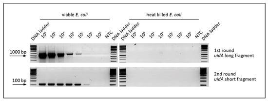 LOD tests applying direct viability nested PCR shown for viable and heat killed E. coli cells. Bacteria were treated with PMA, and DNA was subsequently amplified. PCR products from the first round (uidA long fragment; 1.37 kb) served as templates for the second PCR round (uidA short fragment; 96 bp). The No Template Control (NTC) for ensuring the purity of PCR reactions was also amplified by PCR. All PCR products were verified using analytical agarose gels.