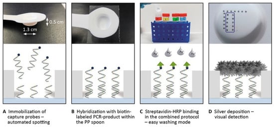 Schematic principle of the chip-based detection system using spoon-shaped PP chips: automated spotting of the capture probe array within the PP spoon cavity (A), hybridization of immobilized capture probes with biotin-labelled (blue dot) ssPCR products in the spoon cavity covered with PCR foil (B), interaction of the streptavidin horseradish peroxidase complex (green arrow) with biotin (C), and enzymatic silver deposition and visual detection (D).