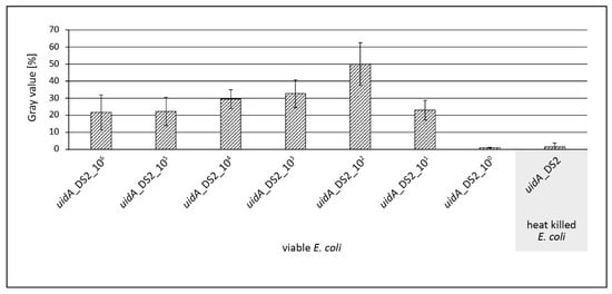 Grey value analysis of PP microarrays to verify the LOD of the newly designed assay. 1 × 106–1 × 100 viable and 1 × 106 heat killed E. coli cells were amplified by direct, nested v-PCR. PCR products from the second round (uidA short fragment; 96 bp) were heat denaturized to generate ssPCR products. For specific biomolecule interaction in the PP spoon cavity, DNA hybridization and enzyme binding were combined. Enzymatic silver deposition on the microarrays was performed to generate robust endpoint signals.