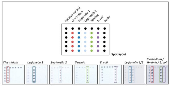 Regarding chip-based analysis of many relevant water pathogens, additional capture probes of appropriate bacteria were investigated. Moldiax GmbH provided those and the required PCR primers (Table 1). Figure 8 illustrates the reliable detection of three further relevant indicators in drinking water, namely Clostridium, Legionella, and Yersinia. In addition to the particular detection of a single species, we also mixed PCR fragments of various pathogens and successfully identified them on the microarray.