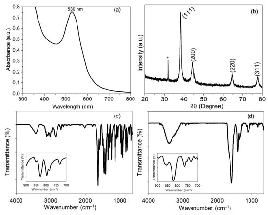 (a) UV-vis spectrum of His@AuNPs, (b) XRD spectrum of His@AuNPs, (c) FT-IR of pure L-histidine, (d) FT-IR of His@AuNPs. The inset shows narrow FT-IR spectra from 700 to 900 cm−1.