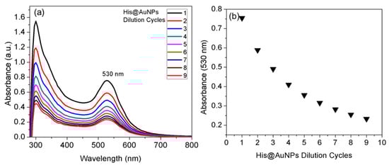 Excessive Na+ from NaOH additive and the presence of residual OH– would cause complications when used for analytical applications. We used centrifugation as a facile purification method, which also allows the removal of unreacted Au ions and uncapped L-histidine molecules [75]. Pellet fraction of His@AuNPs was used to disperse in distilled water and test the impact of successive dilution and ionic strength. The optical properties of His@AuNPs against successive dilution were examined using the measurement of UV–vis spectrophotometer (Figure 2). The plasmon resonance bandwidth (Δλ) and wavelength (λmax) were observed after each dilution by 0.25 mL, used to confirm the excellent stability of His@AuNPs. UV–vis spectrum is presented in Figure 2a, and their absorbance response observed at 530 nm is plotted against a number of successive dilution cycles Figure 2b. The results were used to select the appropriate volume of His@AuNPs resulting optical density (OD) about 0.2 to 0.3 and used in the LSPR detection system. The α-amino moieties and oxygen of the carboxylic acid functional groups are mainly responsible for the healthy capping and stabilization of AuNPs [76]. The surfaces of His@AuNPs remain negatively charged owing to carboxylate (COO−) of L-histidine, and the electrostatic repulsion interactions among His@AuNPs enforce long-term stability in neutral to basic conditions [80].