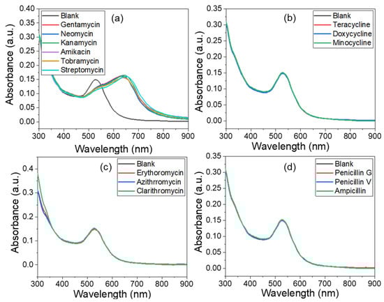 To assess the selectivity of His@AuNPs, we first observed the colorimetric and spectrophotometric response towards different antibiotics from four different classes, including AMG, tetracycline, macrolide, and penicillin, at a concentration of 100 nM. The specificity of His@AuNPs was examined for other tested antibiotics with identical concentrations and reaction conditions as for AMG antibiotics (Figure 3). Almost all antibiotics selected from the AMG class showed evident colorimetric response from red to blue within a fraction of min; absorbance and spectral change results were then recorded for 25 min (Figure 3a). Our results suggest the coordination of His@AuNPs with AMG class of antibiotics results in apparent amplification of absorbance value observed for 660 nm (Figure 3a). These observations confirm that the plasmon coupling interactions among His@AuNPs occur intensely after the coordination of AMGs [81], resulting in an identical bathochromic shift at 660 nm (Figure 3a). However, antibiotics from other classes cannot cause color change or red-shift or peak broadening, or aggregation of His@AuNPs (Figure 3b–d), thus the possibility of developing a highly selective LSPR biosensor for AMG antibiotics. On this basis, we propose an LSPR biosensor for screening or quantitative detection of AMG antibiotics using His@AuNPs. This novel LSPR biosensor is highly selective towards AMG antibiotics owing to identical structural and functional features.