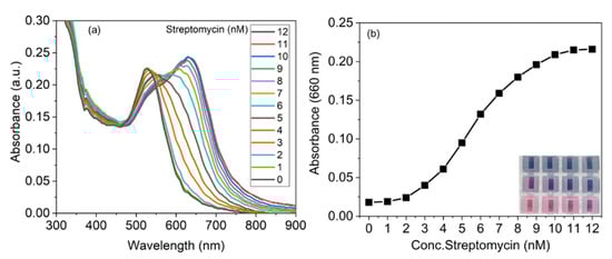Then sensitivity of His@AuNPs has been examined towards streptomycin, a model AMG antibiotic in water. Consistent with the increasing concentration of streptomycin, absorbance response at 660 nm and UV–vis spectral shift with broadening towards larger wavelength (660 nm); such peaks emerge quickly and stabilize within 25 min (Figure 4a). The absorbance response was reliant on streptomycin concentration, which was observed identical to the sigmoidal curve (Figure 4b). Concentration-dependent color change from red to blue was also observed with increasing streptomycin of concentration; it can be seen in the inset of Figure 4b. The lowest visual detection concentration by the naked eye is about 4 nM. These results show that His@AuNPs results in a degree of aggregation with the increasing concentration of streptomycin. The absorbance response recorded at 660 nm was found reliant on the concentration of streptomycin; it is used to prepare a calibration plot over a nanomolar range of streptomycin from 0 to 12. His@AuNPs based sensors exhibited a coefficient of determination (R2) value of about 0.949 and good sensitivity for streptomycin with a LOD of 1.5 nM; the value is competitive compared to other reported methods [21,82,83]. These results suggest that His@AuNPs can develop practical applications for screening residual content or quantifying specific AMG antibiotics in water samples.