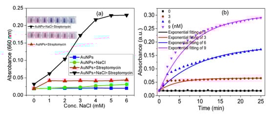 (a) The absorbance response of His@AuNPs against increasing concentration of NaCl recorded at 660 nm in the presence and absence of the streptomycin, (b) The real-time course of the absorbance intensity of His@AuNPs recorded at 660 nm in the presence of the streptomycin concentration (0, 3, 6, 9 nM) with 1 min interval for 25 min.