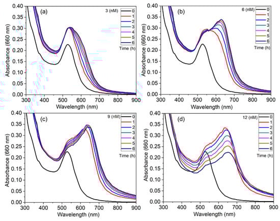 Most of the colorimetric methods report the color and spectral changes in response to the target analyte. Herein, the temporal evolution of UV–vis spectrums was also investigated to reveal the fate of His@AuNP aggregates. It was readily observed by measuring UV-vis spectrums of His@AuNPs against four different streptomycin concentrations (3, 6, 9, and 12 nM) within the time frame of 1 to 6 h (Figure 6a–d). The longitudinal band owing to red-shift initiates apparently but stabilizes within 6 h for streptomycin (3 nM), indicating fractal growth pattern for His@AuNP aggregates (Figure 6a). Similarly, significant growth of His@AuNP aggregates found within 1 h, stabilizes within 6 h for streptomycin (6 nM) (Figure 6b). His@AuNPs aggregates were found to increase significantly within 1 h for streptomycin (9 nM); then, they remain stable, as seen in Figure 6c. However, His@AuNPs absorbance was found to increase to maximum within 1 h for streptomycin (12 nM), and consistently cause a decrease in absorbance at 660 nm indicates sedimentation of aggregates (Figure 6d). Thus, the growth of His@AuNPs aggregates attributes to the streptomycin concentration, such changes can be readily monitored using Uv-vis spectrophotometer [70].