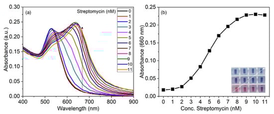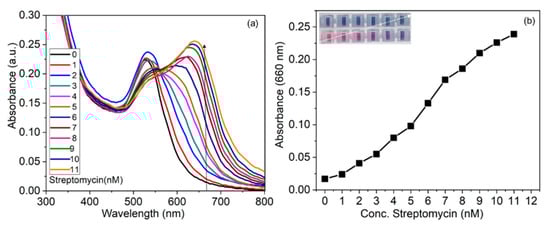 (a) UV-vis spectral response of His@AuNPs in the response of increasing concentration of streptomycin in milk, (b) a calibration curve of absorbance intensity at 660 nm vs. streptomycin concentration in nanomolar.