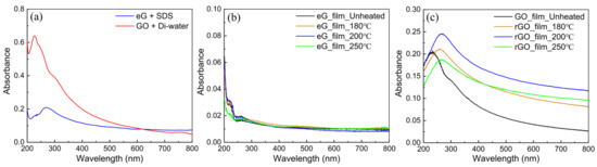 Three sets of samples were prepared for UV-vis characterization (Cary 60 UV-vis, Agilent Technologies, Santa Clara, CA, USA). Set 1 are the solution samples of 60 μL of eG (in SDS) and GO dispersions which were separately diluted in deionized water. Set 2 and 3 are eG and GO thin films which consisted of 10 μL of eG or GO dispersions that were individually coated on four transparent glass pieces by spin coating (2000 rpm, 20 s). To compare with the unheated samples, three of them were heated at 180, 200, and 250 °C.