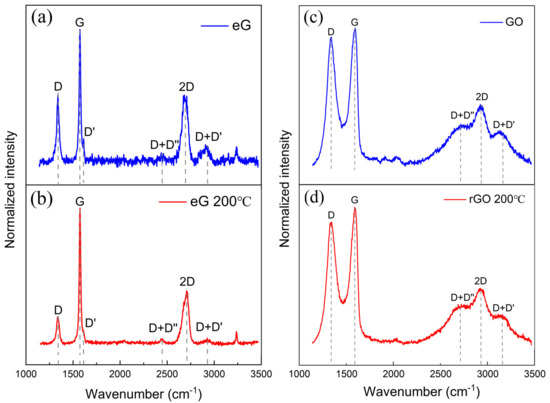 In Figure 4c,d, GO and rGO reduced at 200 °C are compared where D and G, D + D”, 2D, and D + D’ peaks are found at 1350, 1580, 2700, ~2940, and ~3170 cm−1, respectively [51]. The chemical oxidation of graphene introduces defects in the graphene layers, which affects the intensity and the shift of the D bands. In addition, the oxygen groups in the edges and basal surfaces of graphene layers can also affect the intensity and position of the G peak.