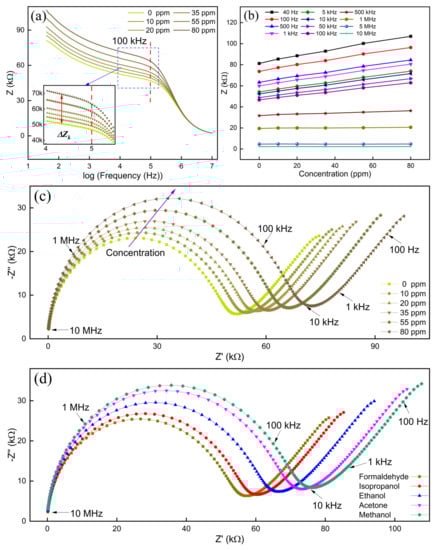 Impedance spectroscopy analysis of the sensor (eG, 180 °C, 1 L), (a) the Bode-plots under different formaldehyde concentrations; (b) calibration curves of the response impedance at extracted frequencies from (a); (c,d) the Nyquist-plots under different formaldehyde concentrations and different types of VOCs at 10 ppm, respectively.
