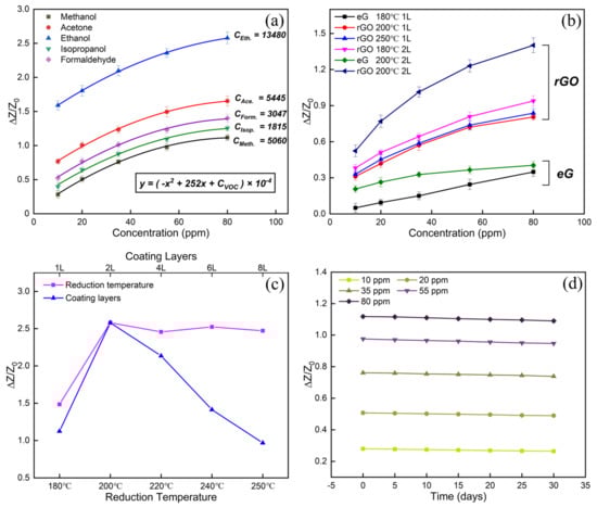 Sensing properties of the sensors constituting the multi-sensor array: (a) calibration curves of the sensor (rGO, 200 °C, 2 L) in dependence on the VOCs concentrations; (b) calibration curves of each sensor characteristic vs. formaldehyde concentration; (c) effects of the number of coating layers and of the reduction temperatures on the relative response change at 80 ppm ethanol; and (d) long-term stability of the sensor (rGO, 200 °C, 2 L) at a constant concentration of methanol (0–30 days).