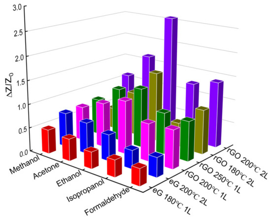 The response of the sensors toward VOCs is quantified as the relative change of impedance; i.e., the percentage ratio (%) between the impedance change and the initial impedance , presented in Equation (2):