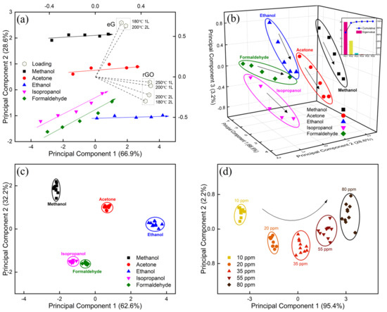 The isopropanol and formaldehyde distributions are parallel and sufficiently distinguishable, but with relatively narrow spacing. The low ethanol concentration overlaps little with the high formaldehyde concentration. Graphene-based materials present similar response towards ethanol, isopropanol, and formaldehyde [61]. Considering the third PC, the cumulative contribution reaches 98.7%. Because Z-axis projection is compressed, the discrimination of clusters in the 3D space is strengthened. The five clusters are completely separated and maintain linear concentration distributions. The isopropanol and formaldehyde distributions are no longer parallel but form a different angle in space and can be separated more precisely. The region low ethanol concentration has a large value on the third PC (PC3) and has an observable distance from formaldehyde. The loading plot in Figure 6a (inset) shows how each sensor impacts the sensor array during the PCA calculation. The rGO and eG are partitioned into two tight clusters, indicating that the two materials play completely different VOCs recognition roles, but similar types of sensors play similar roles. The rGO and eG respectively contribute the highest on PC1 and PC2, so the rGO response property has a decisive effect on the contribution to sample space. At the same time, eG is crucial for the degree of dispersion in the array signal; i.e., the quantification of selectivity.