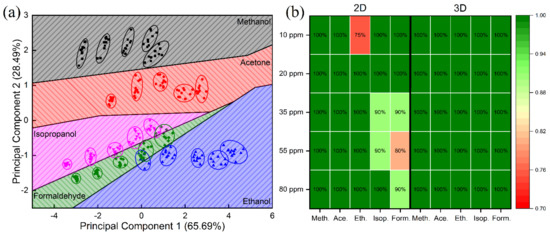 Figure 9b shows the accuracy of the develop system for qualitative and quantitative VOCs recognition in the 2D- and 3D-coordinate systems as a heat map. In the case of the recognition in the 2D-coordinate system, the array provides 75% accuracy at 10 ppm ethanol, 80–90% in 35–80 ppm formaldehyde and isopropanol, and 100% for the other conditions, following the same trend as the information analyzed in Figure 9a. Nevertheless, after considering PC3, overlapping clusters are eliminated, and the accuracy increases to 100%, which is better than when only PC1—PC2 are considered. The analysis results demonstrate the favorable potential of the sensor array in terms of recognition capability and robustness for both qualitative and quantitative recognition.