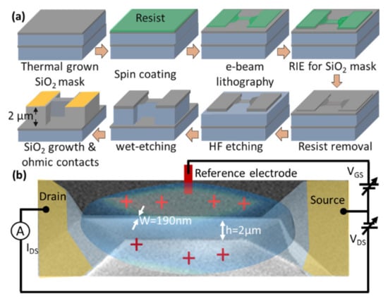 (a) Schematics of the process flow for the fabrication of Si Fin-field effect transistors (FETs). Silicon, SiO2, e-beam sensitive resist, and ohmic contacts are represented in light blue, grey, green and yellow, respectively. (b) Schematics illustrating operation of Si FinFET in liquid gate configuration.