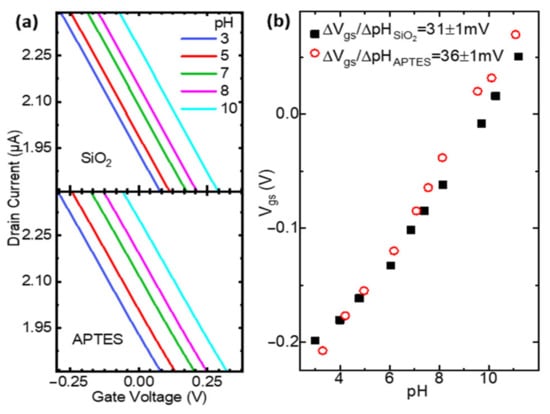 Regarding sensing materials, SiO2 has limitations due to the decrease in sensitivity at acidic pHs and drift [15] that can also be overcome with chemical functionalization, which is cost-efficient for research and prototyping. The acidic saturation of SiO2 that limits the linear pH response occurs because the surface charging is fully dominated by the dissociation of single coordinated silanol groups (with dissociation constant pKa ≈ 6), since the dissociation constant corresponding to the protonation of these groups is too low (pK b ≈ −2) [16]. The linear dynamic range and the isolation of the dielectric barrier of SiO2 to other ions can be improved by changing the surface chemistry with self-assembled monolayers that change the nature or the chemical groups adsorbing protons. The linkage of 3-aminopropyltriethoxysilane (APTES) at the SiO2/liquid interface changes the silanol groups by amino groups that can accept and release protons. APTES functionalization has been reported to improve the linear range of pH sensing [17] and it is also employed as a first step for the functionalization of receptors for detecting DNA and proteins. APTES has also shown an improved stability over time and cycles of pH [18]. The APTES silanization can be performed by solution-phase or vapor-phase methods, although liquid-phase silanization of APTES requires a strict control over the anhydrous phase to achieve uniform layers. Moreover, the inhomogeneities happening during the functionalization of nano-sensors is critical as they result in large variabilities among devices due to the differences in surface coverage that occur in the same length scales of the NWs and which can be also triggered by the topological profile of the nanosensors.