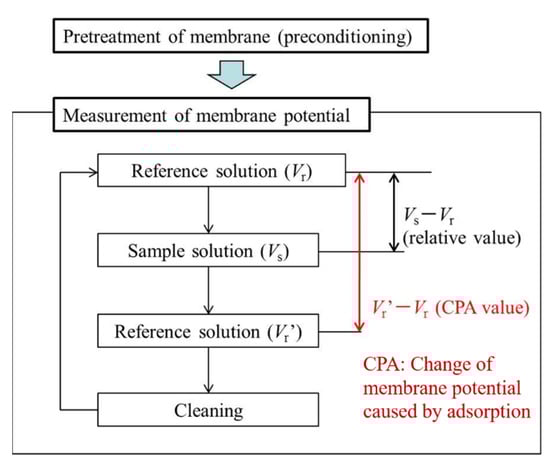 As shown in Figure 3, the two-electrode method was used to measure membrane potentials between the sensor electrode and the reference electrode. Before the measurement, the sensor membrane was immersed in a reference solution for one day to obtain a relatively stable initial membrane potential. The measurement procedure is shown in Figure 4. First, the membrane potential was obtained in a reference solution. Second, was obtained in a sample solution. All samples were made with a reference solution as a buffer. Third, membrane potential was obtained after lightly rinsing the sensor electrodes in a reference solution. The values of and are often different because some hydrophobic substances from the samples remain on the membrane after a light rinse, causing changes in the membrane potential. The change in membrane potential caused by the adsorption is called the CPA value. Finally, the membrane potential was restored to the original value after sufficiently rinsing the sensor electrodes with a cleaning solution comprised of 30 vol % ethanol and 100 mM HCl. The relative value and the CPA value, determined using the following equations, were used as the sensor outputs [,]: