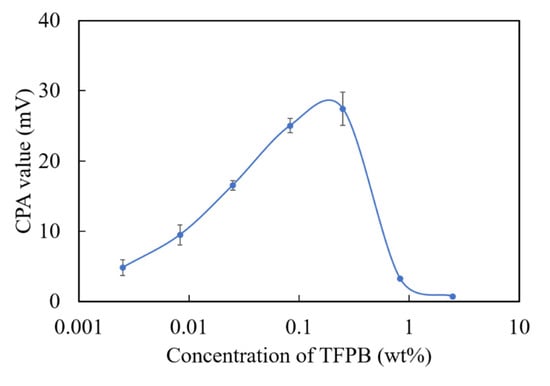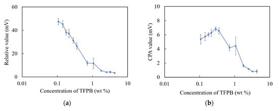 The relative values and CPA values are shown in Figure 2. As shown in Figure 5a, there was a consistent decrease in the relative values with respect to the increase in the concentration of TFPB until 1.8 wt %. The relative value remained unchanged under 5 mV during 1.8–4.3 wt % TFPB. As shown in Figure 5b, the CPA values were found to be insignificant with a maximum of 6–7 mV, while the CPA value of the BT0 sensor was about 36 mV for 0.1 mM quinine hydrochloride []. It can be seen that the TFPB-BBPA-TBAC membrane showed poorer performance than the conventional BT0. The hydrophobic interaction between the membrane and quinine hydrochloride contributed little to the sensor output, and a low response is likely to be obtained around the high concentration of TFPB.