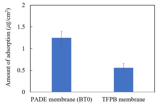 Amount of adsorbed quinine hydrochloride (0.1 mM) on BT0 (PADE-BBPA-TBAC) and TFPB-BBPA-TBAC membrane. The results are expressed as the means ± SD (n = 6, 3 membranes × 2 times).