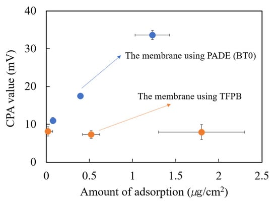 The change of CPA value with the amount of adsorption of quinine hydrochloride (0.1 mM) onto the membrane. The blue dots indicate the BT0 sensor and the orange dots indicate the sensor with the TFPB-BBPA-TBAC membrane. The results are expressed as means ± SD (n = 6, 3 membranes 2 times).