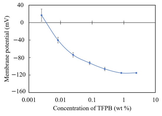 Figure 10 shows the membrane potentials of each TFPB-NPOE membrane in the reference solution. It can be seen that the membrane potential gradually becomes saturated, and a high response is likely to be obtained around the low concentration of TFPB, where a small change in TFPB concentration can make a large change in the membrane potential.