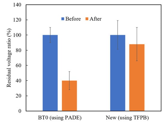 Residual voltage ratios of the BT0 and new TFPB-NPOE sensor. The blue columns represent the residual voltage ratio before the accelerated deterioration process. The orange columns represent the residual voltage ratio after the accelerated deterioration process. The results are expressed as means ± SD (n = 20, 4 membranes × 5 times).
