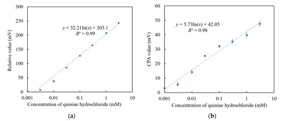 Concentration dependence of TFPB-NPOE sensor on quinine hydrochloride: (a) Relative values; (b) CPA values. The results are expressed as means ± SD (n = 20, 4 membranes × 5 times).