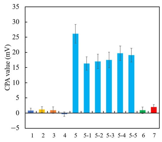 The CPA values for different taste qualities. (1) Saltiness sample (300 mM KCl); (2) sourness sample (3 mM tartaric acid); (3) umami sample (10 mM sodium glutamate); (4) astringency sample (0.05% tannic acid); (5) bitterness (+) sample (0.1 mM of hydrochloride salts of (5) quinine, (5-1) azelastine, (5-2) cetirizine, (5-3) loperamide, (5-4) eperisone, (5-5) hydroxyzine; (6) bitterness (−) (0.01 vol% iso-alpha acid); (7) sweetness sample (1 M sucrose). All taste samples were prepared with the reference solution.