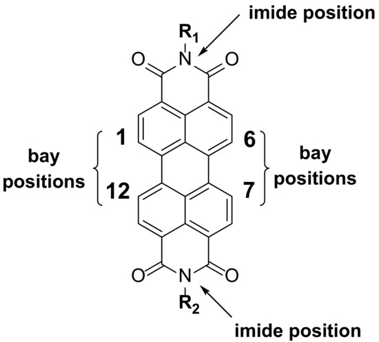 - Huang, C.; Barlow, S.; Marder, S.R. Perylene-3, 4, 9, 10-tetracarboxylic acid diimides: Synthesis, physical properties, and use in organic electronics. J. Org. Chem. 2011, 76, 2386–2407. [Google Scholar] [CrossRef]