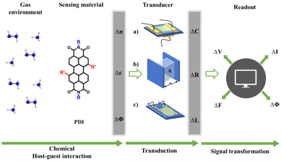 To date, the majority of PDI-based sensors have been developed as chemiresistive, i.e., resistive or amperometric, configurations, as shown in Figure 2c. A chemiresistor usually comprises interdigitated electrodes (IDEs) linked with a sensing material deposited onto an insulating substrate [77]. The resistance, i.e., current, of the sensing material changes upon exposure to the target analytes. Chemiresistive sensors comprise one of the most extensively used device structures for gas-sensing applications due to their simplicity, compatibility with the conventional direct current (DC) circuits, low-cost, predictable electrical properties, ease of high accuracy measurements [77], and suitability when speedy prototyping is essential. The simple design and operation of this type of device renders it appealing starting platforms for studying the chemical response of novel materials. Despite their simple setup, chemiresistors are restricted by their single type of output, which is easily influenced by environmental perturbations.