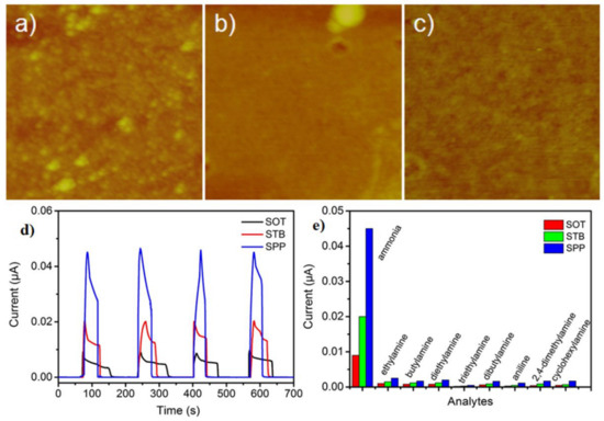 AFM images of (a) SOT, (b) STB, and (c) SPP thin films (2 × 2 μm) illustrating a similar morphology. (d) Dynamic current change of SOT, STB, and SPP devices in ammonia (100 ppm). (e) Current change for SOT, STB, and SPP devices exposed to numerous amine analytes. Adapted with permission [23].