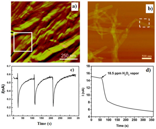 AFM images of (a) PDI-MA and (b) PDI-MP illustrating the ribbon-like morphology. Current change in PDI-MA nanoribbons in response to (c) nitromethane (36000 ppm) and (d) H2O2 (18.5 ppm). Adapted with permission [89,90].
