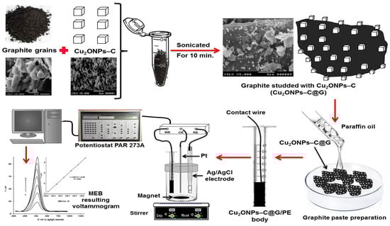 For all stripping voltametric measurements, the used blank solution was a mixture of 0.1 M phosphate buffer (pH ≈ 8.0) and 0.1 M KCl. The preconcentration step was performed by immersing the prepared Cu2ONPs–C@G/PE in a stirred 15 mL of the blank solution at a potential range from −0.6 to +1.0 V for a given period. Once the stirring stopped, the solution was left for 10 s to settle and allow the background current to decrease. The same procedure was repeated in the presence of 2 × 10−5 M MEB. Then, cyclic and square wave anodic stripping voltammograms were recorded in the positive potential direction. To restore the initial activity of Cu2ONPs–C@G/PE, simply removing the outer surface of paste by smoothing its surface against white paper was performed. All measurements were performed at room temperature. A brief description of the working electrode construction and MEB voltametric quantification is shown in Figure 1.