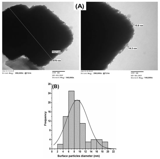 Figure 4 shows the representative TEM image for Cu2ONPs–C@G. As can be seen in Figure 4A, two overlapped microcubes (dark black particles; the diameter of each cube is more than 400 nm) with rough surfaces constructed from nanoparticles (light small black particles). Taking into account the resulting SEM analysis (Figure 3B), and since we used an ordinary mixing method (without using special tools or chemicals), we can assume that there is no significant effect on the morphology or chemical composition of the produced monodisperse cuprous oxide microcubes (Cu2ONPs–C). From the clear surface topography of the right TEM image in Figure 4A, we can conclude that the surface nanoparticles are Cu2ONPs, which self-assembled in an ordered way to build Cu2O microcubes (Cu2ONPs–C). Based on measuring the longest diameter for Cu2ONPs at the cube surfaces, the diameter range was found to be mainly distributed from 4 to 20 nm with an average diameter of about 9 nm (Figure 4B). Due to the high magnification and diameter of the cubes, at the downside of the left TEM image (Figure 4A), we can clearly see part of the graphite layers adherent with the two overlapped cubes.