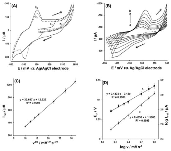 The slope of 0.4856 confirms that the occurred electron transfer was a diffusion-controlled process, since it is very close to the same theoretically expected value of 0.5 for a pure diffusion-controlled process [51]. In the same voltammogram, we can see that a positive shifting occurred in the peak potential with increasing scan rate values, which confirms the irreversibility nature of the recorded oxidation process [51]. Figure 6D (b) shows a linear relationship between peak potential (Ep) and scan rate logarithm (log ν), which can be expressed by Equation (5) as follows: