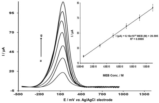 In the current article, SWAdASV was selected for the quantification of MEB. The obtained SWAdASV for the successive additions of MEB and its corresponding calibration graph are shown in Figure 8. This voltammogram was conducted using Cu2ONPs–C@G/PE as the working electrode in 0.1 M phosphate buffer solutions (pH ≈ 8) containing 0.1 M KCl. As previously explained in the electrochemical behavior of MEB on the Cu2ONPs–C@G/PE, the current value corresponding to the added concentration of MEB (Inet) is equal to the difference between the current value resulting from Cu+ oxidation (Ii) and the current resulting from the oxidation of the formed MEB–Cu complex (It). The obtained results were applied to draw the calibration graph shown in Figure 8 (inset), which shows a linear dependency between the recorded current response and MEB concentration in the range of 5.00 × 10−11 M–1.10 × 10−9 M and can be expressed by Equation (6) as follows: