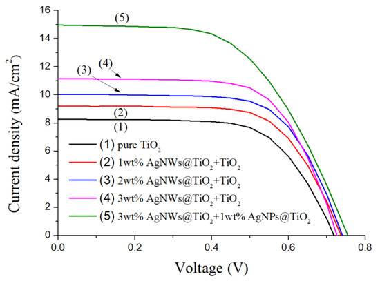 Figure 5 shows the photovoltaic performances of the DSSCs with the different photoanodes. Table 1 listed the corresponding photovoltaic parameters of different photoanodes. From the double-layer photoanodes made by different composite materials shown in Figure 5 and Table 1, the performance of the DSSCs improved the short-circuit photocurrent density (JSC). The increased JSC and efficiency when AgNWs@TiO2 was used to replace the charge transport layer were due to the conductive properties of AgNWs. The open-circuit voltage (VOC) error of each sample was very small at about ±0.01 V. For the DSSCs with different weight percentages of AgNWs, their JSC reached to 8.26, 9.18, 10.04, 11.15, and 15.02 (mA/cm2), respectively. The material properties of AgNWs provided excellent electronic conductivity of the photoanode, and the unique LSPR effect of nanometals significantly improved the light capture, which was the reason for the increased JSC.