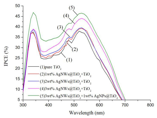 Huang et al. [21] reported that the improved efficiency of DSSC made by AgNWs@TiO2 is due to the decrease of the interface charge transfer resistance and the ion diffusion resistance in the electrolyte. It is worth noting that with the increase of nanometal, one-dimensional nanostructures (AgNWs) are overloaded, and the host (TiO2) is not able to maintain the electron path. The breakage and fragmentation of the film can reduce the quality of the film, as indicated by the gradual decrease in the fill factor (FF). These results indicate that there are limitations in increasing the amount of doping. To prove that the LSPR effect caused the light absorption to increase, we also measured quantum efficiency. The incident photon-to-electron conversion efficiency (IPCE) curves of the DSSCs are shown in Figure 6. Under normal circumstances, it can be determined that nanostructures with a diameter of less than 90 nm are very strong light absorbers and nanostructures with a diameter greater than 90 nm help scattering [23]. It can be seen from the TEM image in Figure 4b that the average size of AgNWs synthesized by the polyol method is about 45–55 nm in diameter, indicating that these AgNWs will strongly absorb visible light through the LSPR effect [12,13]. In the IPCE curves, it was found that AgNWs enhanced the light capture around wavelength region 550 nm. Compared with the DSSC 1 made of pure TiO2, the JSC and efficiency of the DSSC 4 are more prominent. Compared to the TiO2 photoanode, the IPCE value increased by 23%.