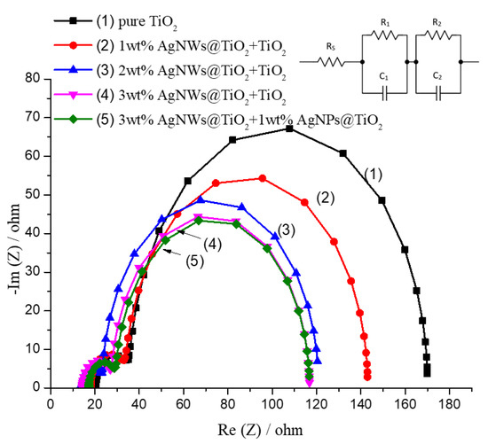 To understand the interface electron conduction process, different electrochemical impedance analysis circuits and Nyquist plots of DSSCs are shown in Figure 7 [24]. Table 2 lists the charge transfer resistance (R1, R2), the imaginary capacitance (C1, C2) of the platinum counter electrode/electrolyte interface, and the photoanode/electrolyte interface; RS stands for contact resistance.