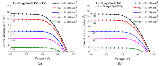 J-V curves of DSSCs under different light intensities. (a) 3 wt% AgNWs@TiO2/TiO2 and (b) 3 wt% AgNWs@TiO2/1 wt% AgNPs@TiO2.