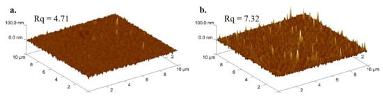 Atomic force microscopy (AFM) surface roughness profiling of (a) billowy gold nanostructure (BGN) and (b) gold nanoframe array (GNA) structures.