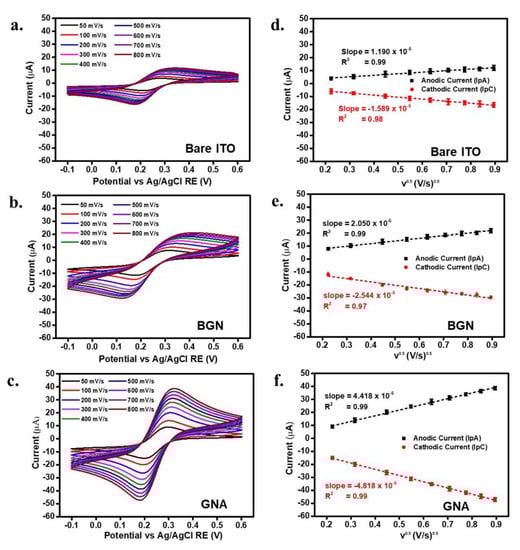 In addition to determining the distinct Au array configuration and the Au particle percentage, surface roughness measurements were performed to validate the total usable nanostructured surface area for a larger sensing site as well as to overcome the challenge of ion interference during the measurement [43]. The two nanostructures were then subjected to cyclic voltammetry analysis using an ionic redox probe at a series of scan rates. In all the ITO, BGN, and GNA electrodes, as seen in Figure 4a–c, the peak current gradually increased with increasing scan rates. The increment of the current range (y-axis) is recorded with each stage of surface modification from bare ITO, BGN, and finally, GNA structures. This finding is correlated to the transformation of the surface morphology and topology in each surface modification, from bare ITO owning a planar 2D surface, BGN with its 3D curvy structure, and finally GNA with its larger surface area produced by its regular ring-like structure. The higher surface area in GNA allows a more intense redox reaction, which consequently requires higher currents in cyclic voltammetry. As shown in Figure 4d–f, the plot of the extracted anodic currents is linear with the square root of scan rates in the range 50–800 mV/s, reflecting the characteristics of a quasi-reversible diffusion-controlled electrode process [44]. The surface area calculation is performed using the Randles–Sevcik formula as follows [27,45]: