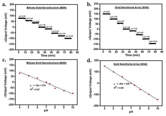 Real-time measurement of pH in 10 mM H2O2 and the respective calibration plots performed by a portable CVCC circuit using the (a,c). billowy gold nanostructure (BGN) and (b,d). gold nanoframe array (GNA) electrodes.