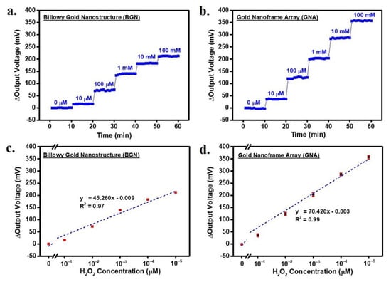 Real-time measurement of H2O2 solution and the respective calibration plots performed by a portable CVCC circuit using the (a,c). billowy gold nanostructure (BGN) and (b,d). gold nanoframe array (GNA) electrodes.